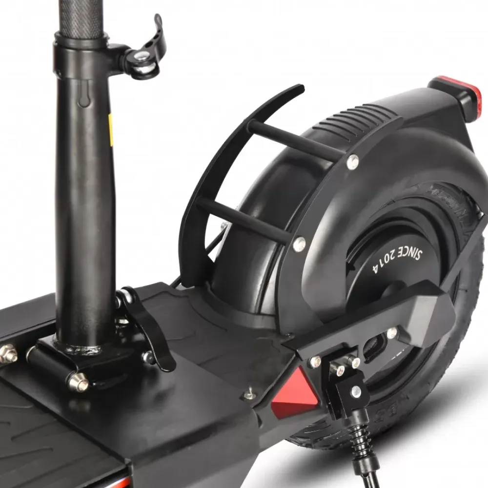 Алюминиевый сплав - это материал электросамоката, он легкий и прочный, в связи с чем его вес всего 23 килограмма, а на борт можно подняться с предельной массой в 125 килограмм. Вы сможете не только самостоятельно кататься, но и перевозить любые вещи, положив их с собой. Электромотор самоката позволит вам достигнуть максимальной скорости в 45 км/ч. Задний привод и надувные колеса с диаметром в 11 дюймов позволят вам передвигаться с максимальным комфортом и чувством защищенности.