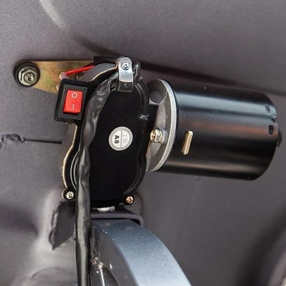 Несомненным достоинством модели является закрытая кабина и наличие прочной крыши. Подобная особенность позволяет использовать технику при любых погодных явлениях. Утолщенное лобовое стекло надежно защищает от ветра. Свободное прохождение препятствий на дороге возможно благодаря усиленным передним и задним амортизаторам.