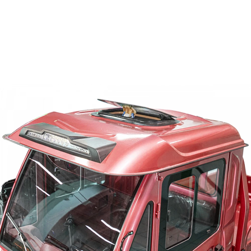 Грузовой электротрицикл Rutrike КАРГО Кабина Дуал красного цвета - это инновационное транспортное средство, которое сочетает в себе эффективность, экологичность и функциональность. Сконструированный для перевозки грузов, этот электротрицикл обладает высокой проходимостью и надежностью.